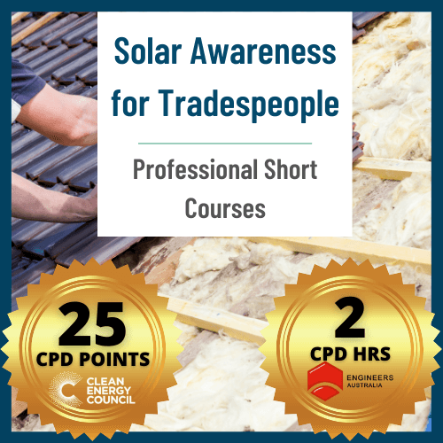 Students will receive a GSES certificate of completion stating they have completed the Solar Awareness for Tradespeople course. Upon completion, CEC (Clean Energy Council) accredited designers/installers will be eligible for 25 CPD points.